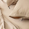 Close-up on beige coloured invisible-zip pillowcases, on the bed. Beige bedding set shown on bed with a curtain in the background.