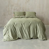 Sage green quilt cover set on a bed, against a neutral concrete look backdrop. Sage green quilt cover magnetic close-up, draped over bed. Sage green quilt cover magnetic corner close-up. Sage green quilt cover set on a bed, against a neutral concrete look backdrop.