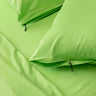Close up of two lime-green invisible zip pillowcases on the matching bed sheets. Close-up of a lime green bedding set showcased on a bed, against a neutral background and a beige curtain.