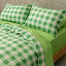 Meadow green gingham print quilt cover set on a bed, against a neutral concrete look backdrop. Meadow green gingham print quilt cover set on a bed. Close up of the pillowcases against a contrasting green sheet set. Meadow green gingham print invisible zip pillowcase close up.