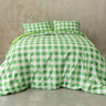 Meadow green gingham print quilt cover set on a bed, against a neutral concrete look backdrop. Meadow green gingham print quilt cover set on a bed, against a neutral concrete look backdrop. Meadow green gingham print quilt cover close up. Meadow green gingham print quilt cover set on a bed. Close up of the pillowcases against a contrasting green sheet set. Meadow green gingham print quilt cover magnetic corner close up. Meadow green gingham print invisible zip pillowcase close up.