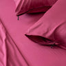 Close up of two invisible zip raspberry pink pillowcases on a bed that has the matching sheets. Raspberry pink bedding set on a bed, against a neutral background and beige curtains.