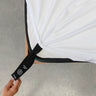 Close up or corner strap being pulled in White fitted sheet White bedspread on a bed with white pillows against a beige curtain background Close up of black corner strap in on white bedding Close up of pillows with zip detail in white bedding